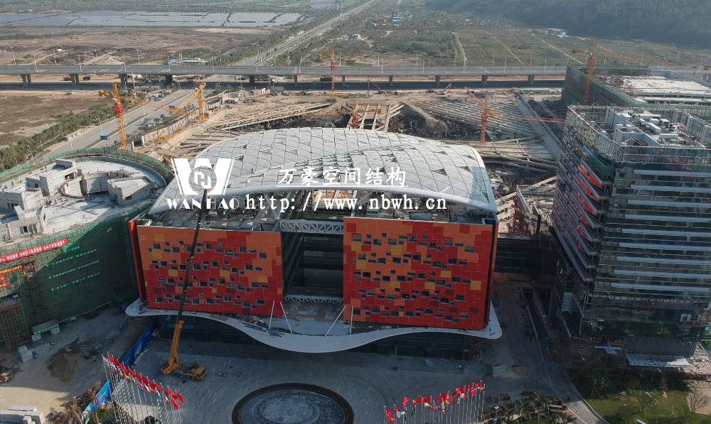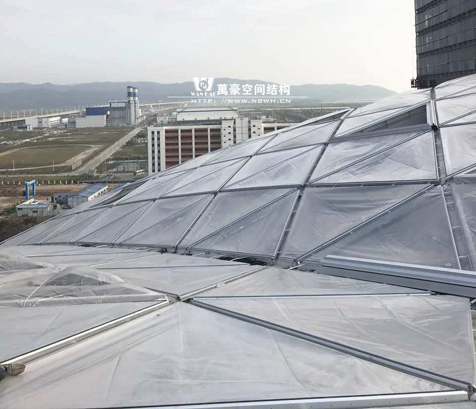 位于广东省珠海市横琴新区。本工程一期用地面积22119㎡,总建筑面积63486.63㎡。建筑高度为36.5m,结构形式为骨架式气枕膜结构;上部为钢结构单层双曲面钢网壳+双层ETFE气枕膜覆盖,气枕总面积约23000平方米,共计750个ETFE气枕,93个开启式天窗,3000多根杆件组成,用钢量2000多吨,单体构件大结构复杂。