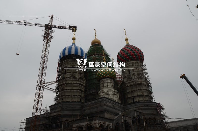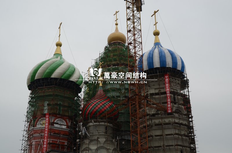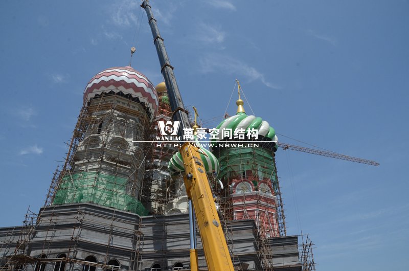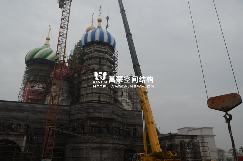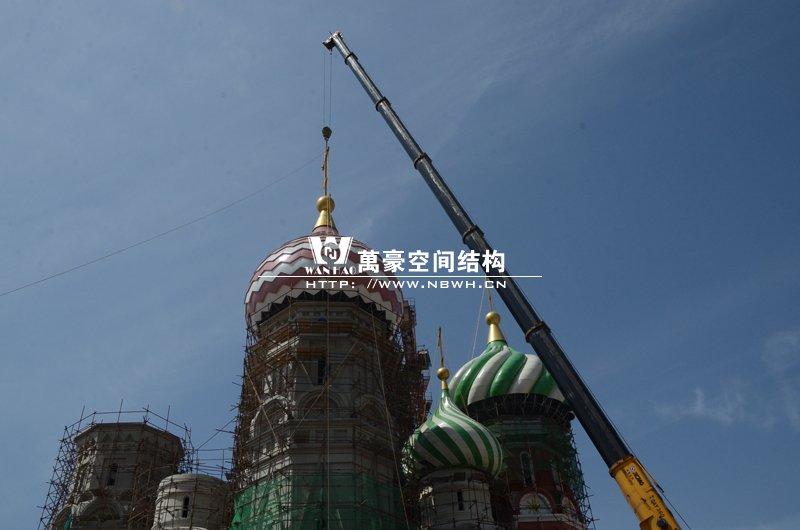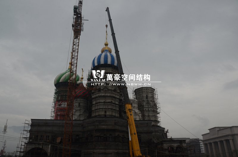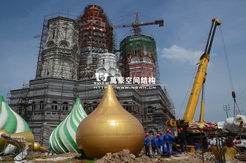 横店影视城俄罗斯馆屋顶钢结构装饰球吊装完成,本次吊装的九个装饰采用钢结构骨架、铝合金外壳,最重的装饰球达20来吨,采用300多吨的大吊车进行吊装。