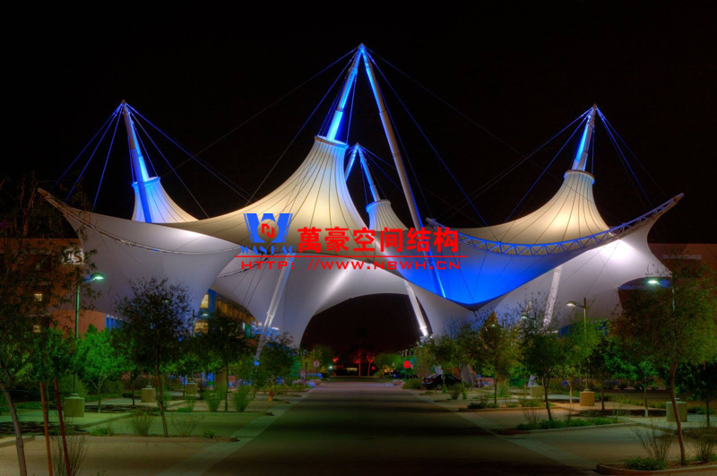 工程的膜材是氟塑材料表面涂层与织物布基按照特定的工艺粘合在一起的薄膜材料。常用的氟塑材料涂层有PTFE(聚四氟乙烯)、PVDF(聚偏氟乙烯)等。织物布基主要用聚酯长丝(涤纶PES)和玻璃纤维有两种。膜材的粘合就是将涂层与基材合二为一组成通整体。膜结构建筑结构所用的膜材大多是以压延成型和涂刮成型的。所谓压延成型,就是将选定的软PVDF经塑炼后投入压延机,按照所需厚度、宽度压延成膜,立即与布基粘合,再经过轧花、冷却即可制得压延膜材。而涂刮成型,则是将聚氯乙烯糊均匀地涂或刮在布基上,再加热处理即可获得涂刮膜材,普遍的是采用刮刀直接涂刮,也有采用辊式涂刮的。