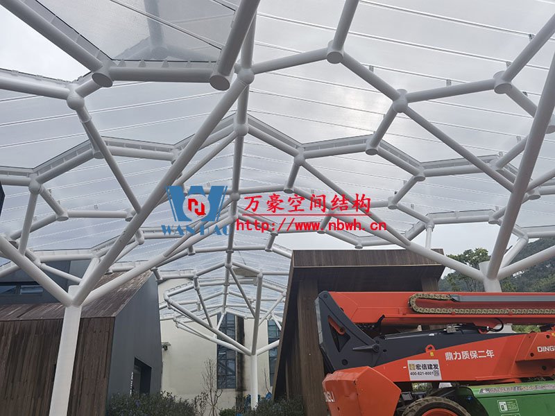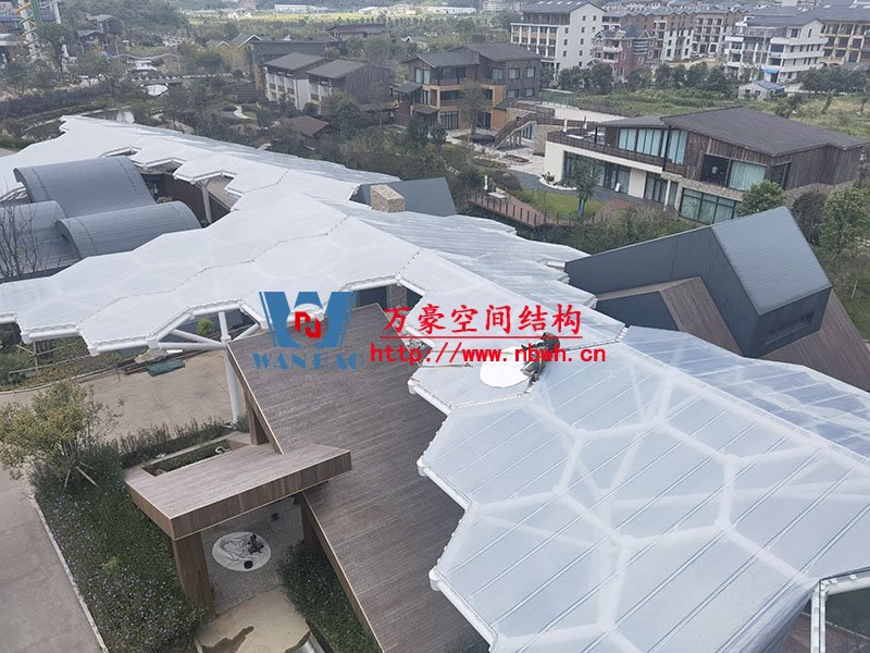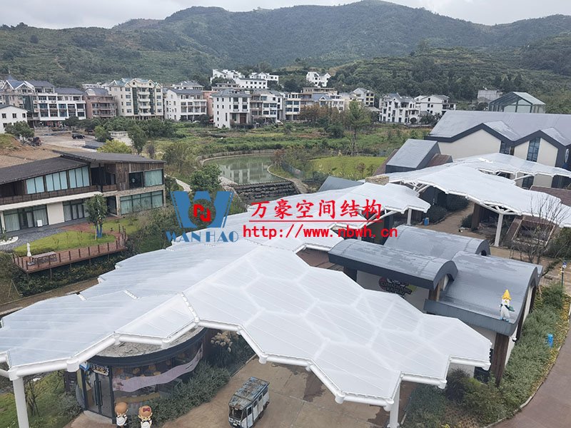 雨棚包括6号商业街蜂窝状ETFE膜结构、检票口PTFE膜结构、售票口PVDF膜结构。