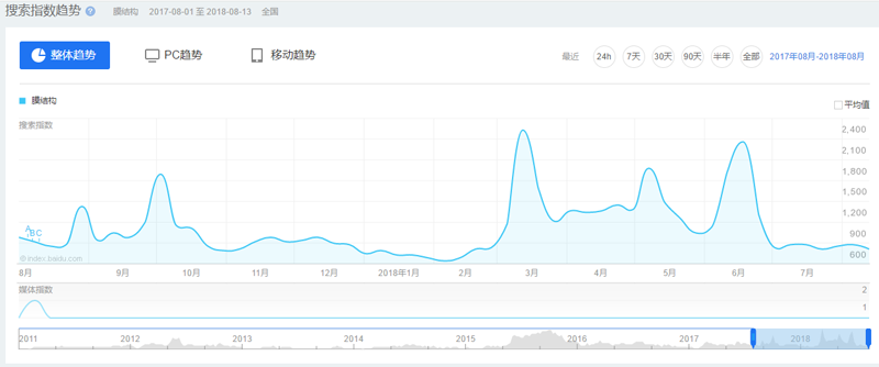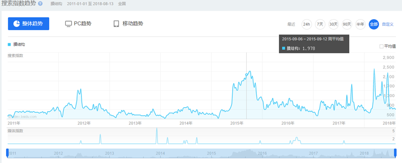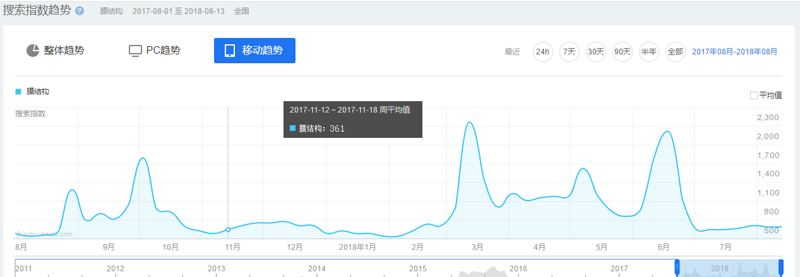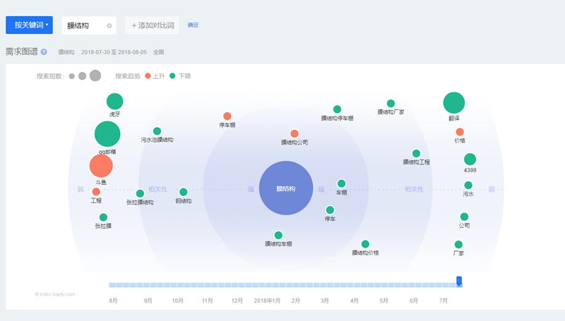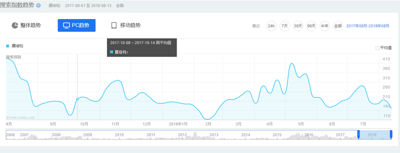 最后,就是中国膜结构网的热度趋势了。近些年来,膜结构行业在中国稳步提升,每年的旺季分别在3到6月份,以及8到10月份,所以想做膜结构的伙伴们可以选择这个时段去做哦。