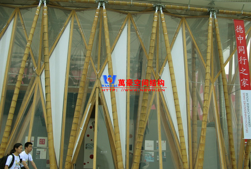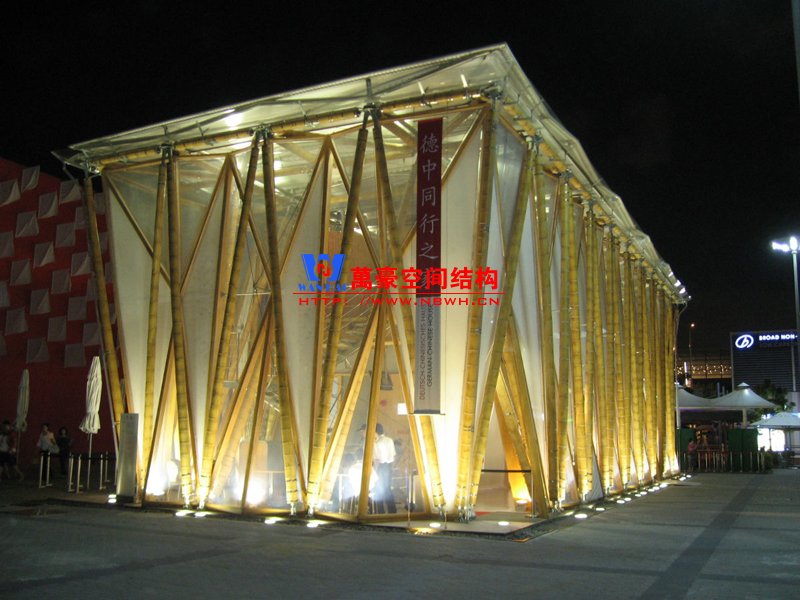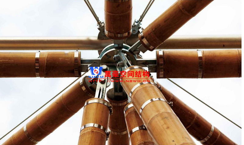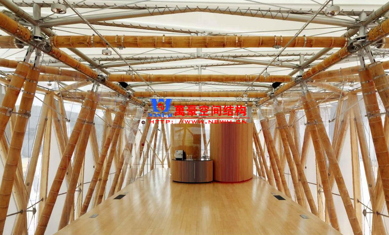 内部楼板由胶合竹板制成的巨型梁柱体系架构,其连接构件及表面处理技艺均为此建筑量身打造。高达六米的梁柱将建筑内部进行二次分割,营造出独立的二层楼面空间。竹杆支撑体系在建筑屋面层通过钢节点相互连接固定。屋面面层采用PVC 膜覆盖,墙体结构则由天然竹材和透明轻盈的新型材料ETFE膜复合构成。整个
