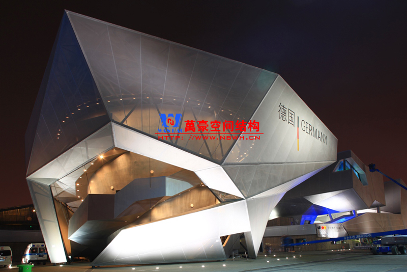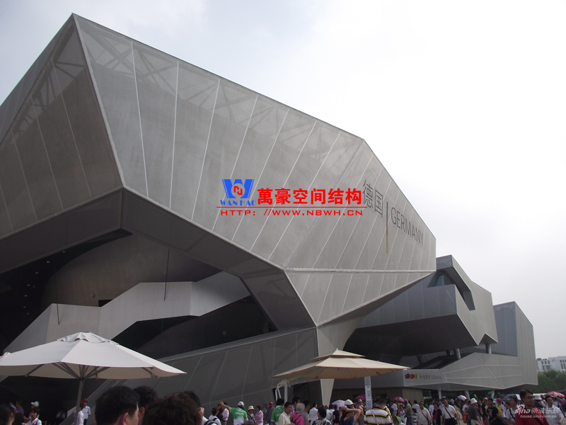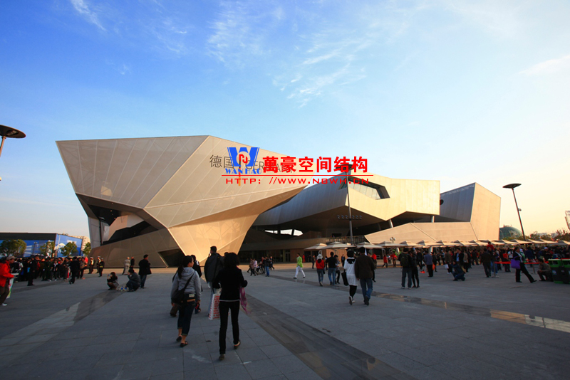 世博会德国馆膜结构建筑建成于2009年7月,于2010年在中国上海世博会上正式投入使用,是中国国内经典膜结构建筑之一。德国馆位于卢浦大桥附近的黄浦江南岸,与瑞士、法国和波兰馆相邻,占地面积6000平方米。由于膜结构材料的特殊属性,可以让德国馆的形态呈不规则状,十分的别致。展馆四面呈开放状,其建筑设计给人一种轻盈、飘逸的感觉,又像是在邀人同游。德国馆的建筑体外部由一层透明的银色发光建筑膜结构包装起来,展馆的四大建筑主体悬架于和谐都市展厅入口所在的底层区域。
