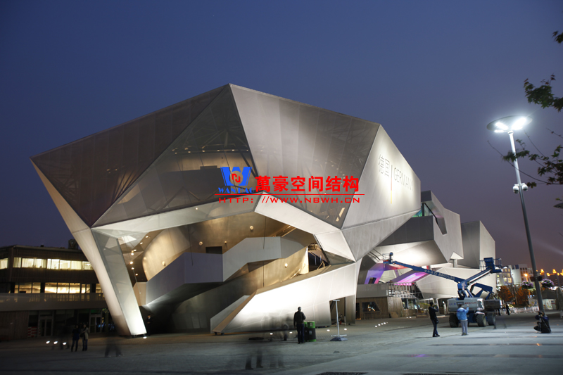 展馆设计由自然景区和展馆主题两大部分组成。参观者游历和谐都市之旅从展馆底层起落有致的自然景园开始。前往展厅入口的路也是等候区。这一路整个就像走迷宫一样,要穿过不同的空间、隧道、空地和院落。入口在展馆一层的斜坡景区内,通往展馆城区展厅的大门在此为参观者打开。穿过一条隧道,参观者便踏进了和谐都市内设计布置奇妙的都市生活的体验空间。展馆由自然景区和展馆主体组成,外墙包裹透明的银色发光建筑膜,主体由四个头重脚轻、变形剧烈、连成整体却轻盈稳固的不规则几何体构成,阐释了“和谐城市”的主题。