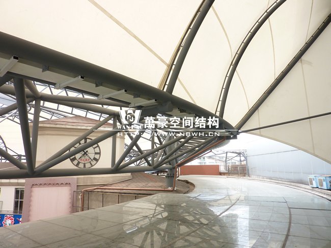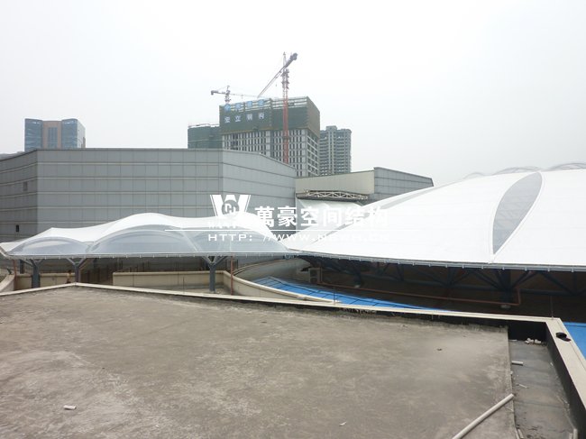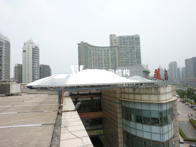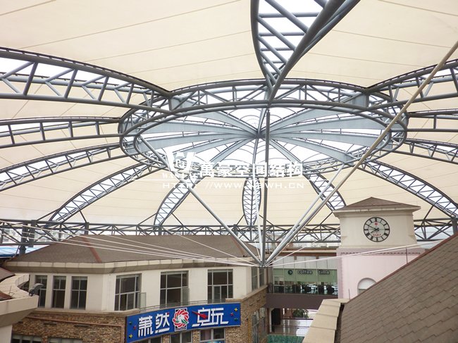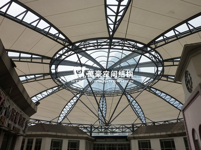 工程位于萧山开元广场商业购物中心,整体工程采用骨架穹顶结构,屋面直径为50米,总面积约6000平方米,屋盖体系脉络清晰流畅,造型简洁有力,力图体现结构与材料的自身美感,精致的钢架,洁白的膜材,赋予建筑高技派和未来主义色彩。
