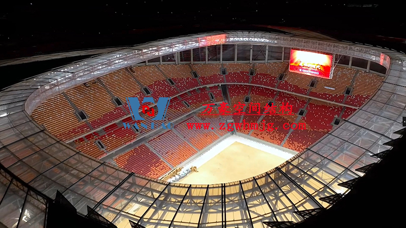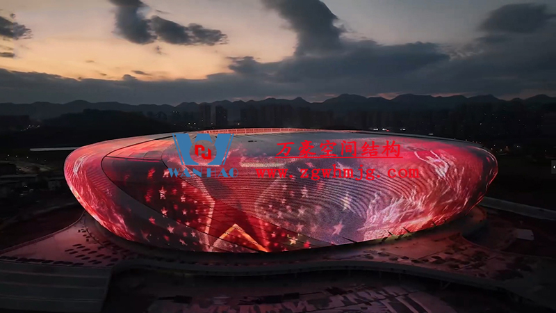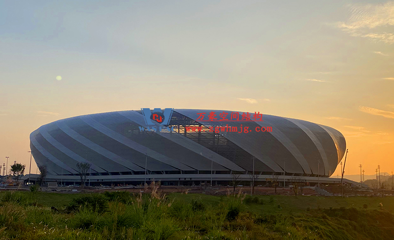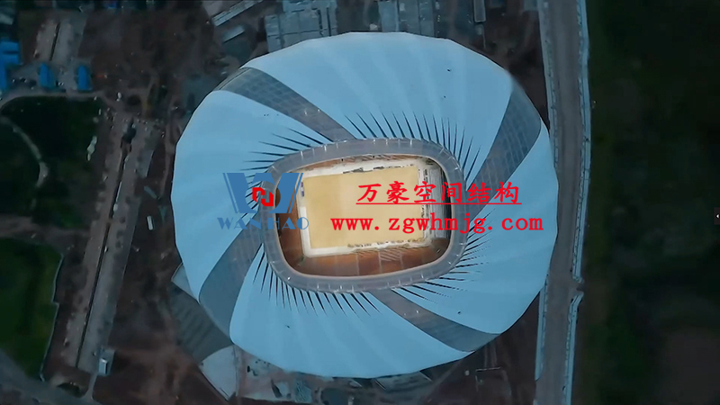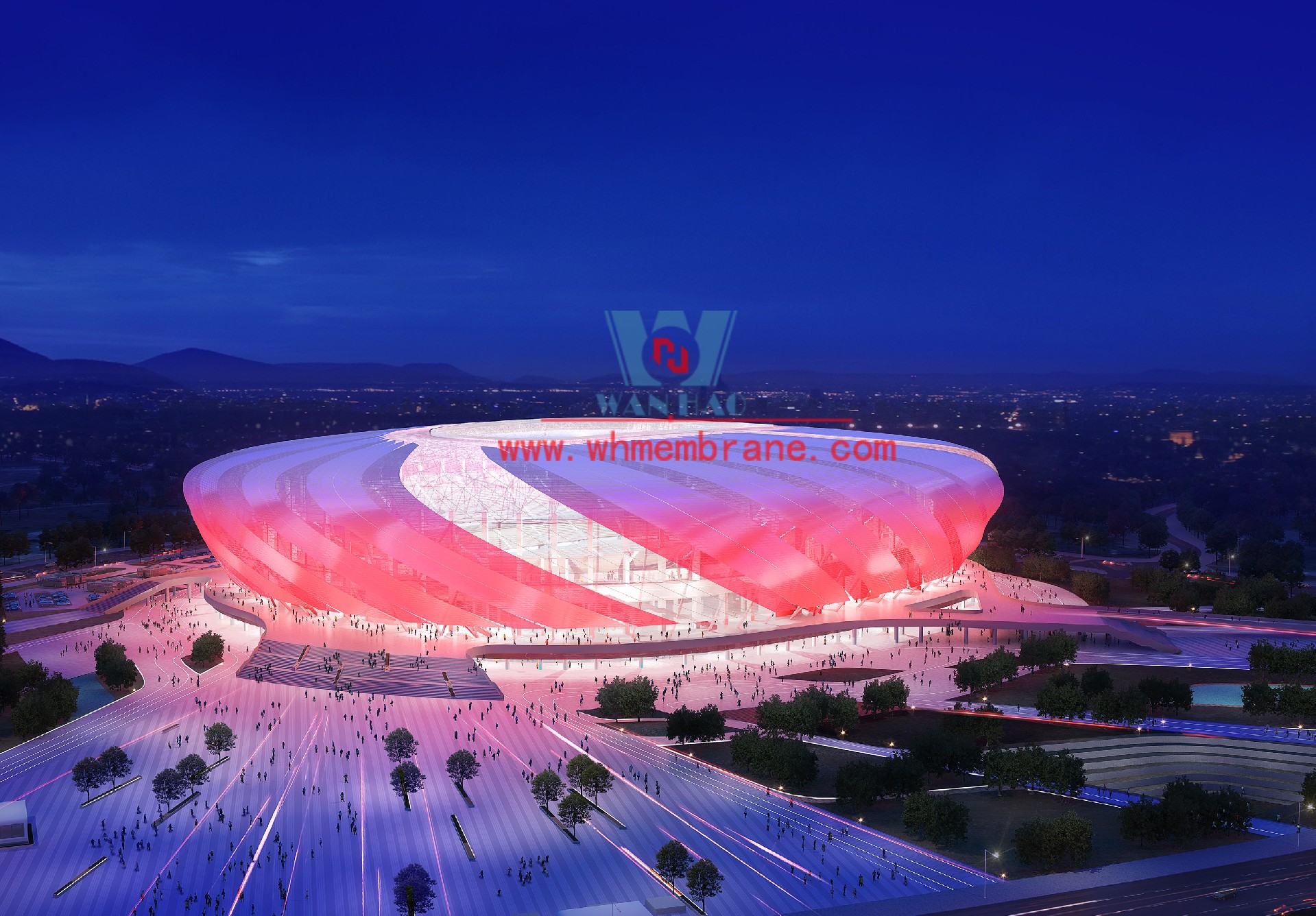 重庆龙兴足球场项目位于重庆市两江新区,占地面积约303亩,总建筑面积约17万平方米。足球场钢屋盖平面呈椭圆形,南北投影长283米、东西宽252米,屋面最大高度59.5米。该项目部分屋面材料选用进口高自洁ETFE膜材, 膜结构展开面积合计30000平米。