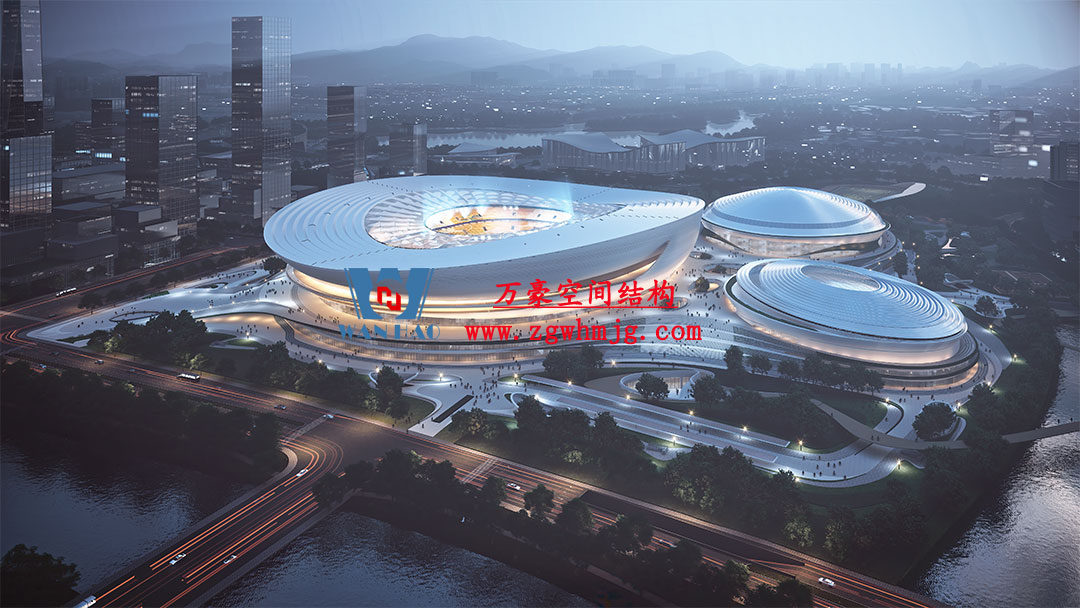 杭州余杭国际体育中心,位于浙江省杭州市余杭区杭州未来科技城.该项目二次钢构用钢量9000吨,PTFE膜展开面积40000平方米,是长三角最大覆壳式膜结构体育建筑。