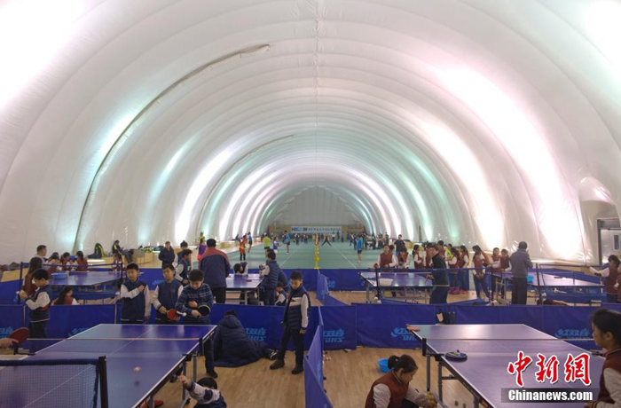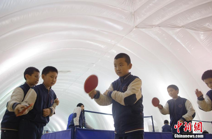 12月1日,一群学生在北京市某学校充气膜结构体育馆学习乒乓球。该体育馆的PM2.5过滤系统能够过滤输入室内的空气,过滤后的空气通过风道输送至充气膜内。充气膜内气压大于室外气压,可以将PM2.5隔绝在充气膜馆之外。中新社记者 刘关关 摄 (来自:中国新闻网)