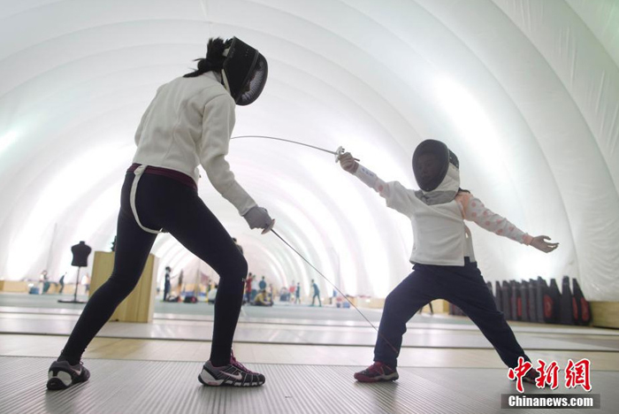 12月1日,一位学生在北京市某学校充气膜体育馆学习击剑。11月29日空气重污染橙色预警;11月30日霾橙色预警;12月1日大雾橙色预警。北京史上首次三个预警全“橙”发送。截至昨日,今年最严重空气污染过程已持续了5天。昨夜,冷空气抵达北京,雾霾逐渐消散。今起至4日,京城空气优良。昨日24时,市空气重污染应急指挥部解除北京空气重污染橙色预警。 (来自:中国新闻网)