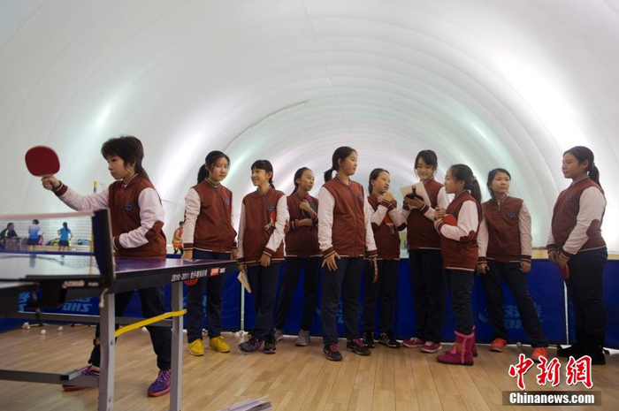 12月1日,一群学生在北京市某学校充气膜体育馆学习乒乓球。 (来自:中国新闻网)